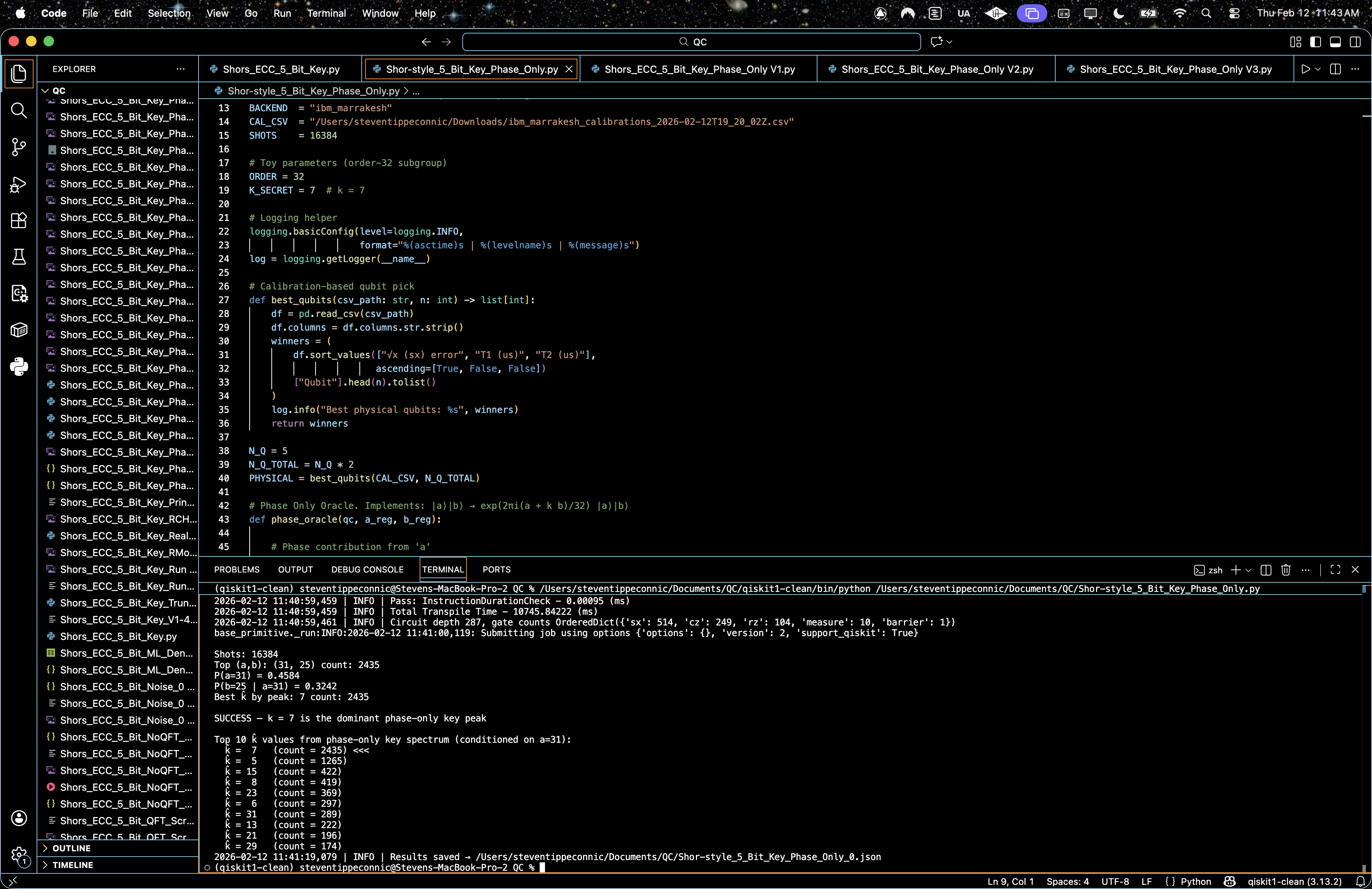 Thus the QFT converts the global linear phase relation imposed by the oracle into localized spectral amplitudes, producing a dominant peak at (u, v) = (31, 25).