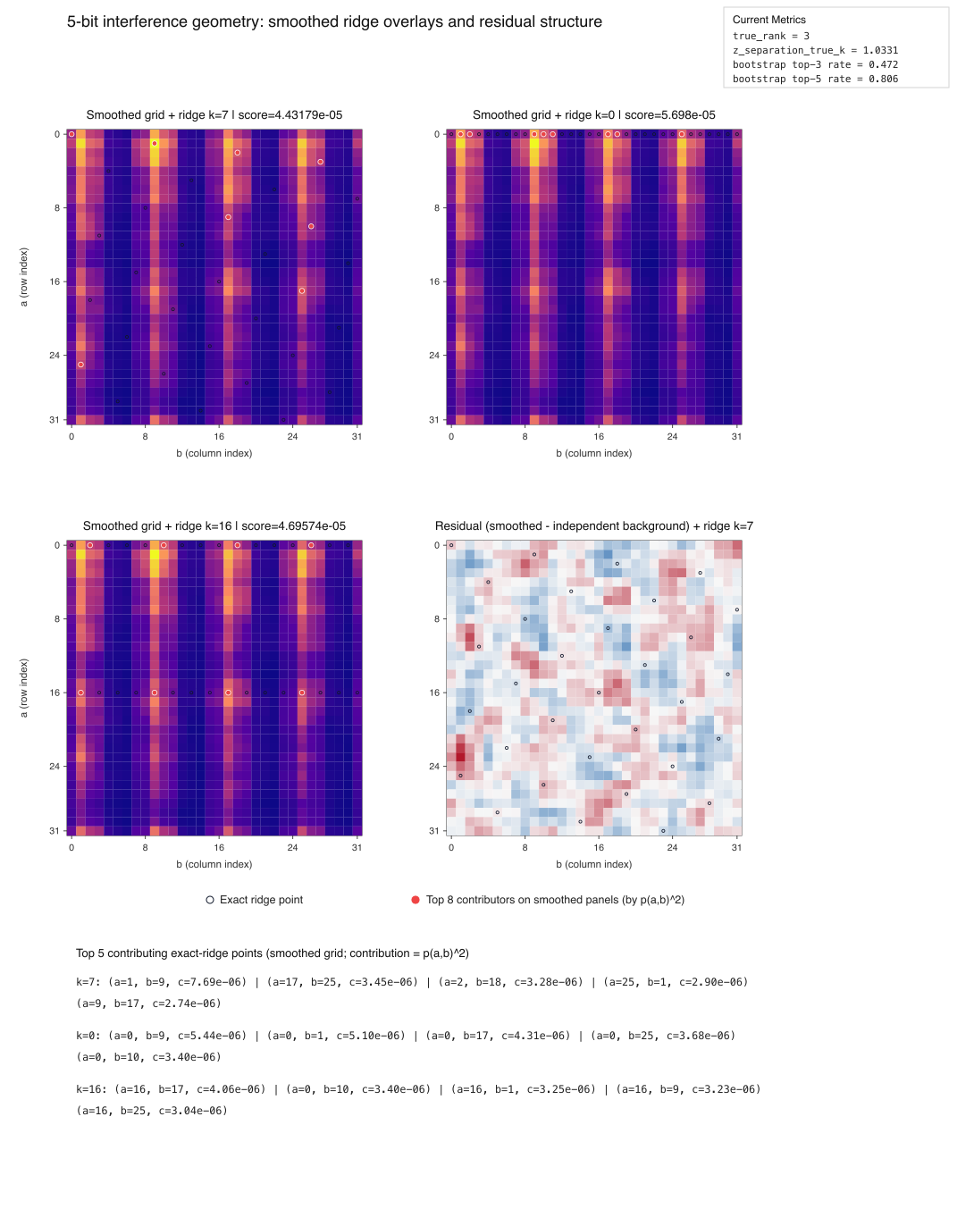 In the end, the main thing I learned is that the fixed 5-bit result contains more recoverable structure than the original raw ridge score showed, but that structure lives inside a bias-dominated field with a small set of recurring competitors. The true key leaves a persistent and measurable interference signature, while the measured distribution also contains stronger modes driven by marginal structure and a few high-intensity cells. I’m open sourcing full analysis files, project, and note below.